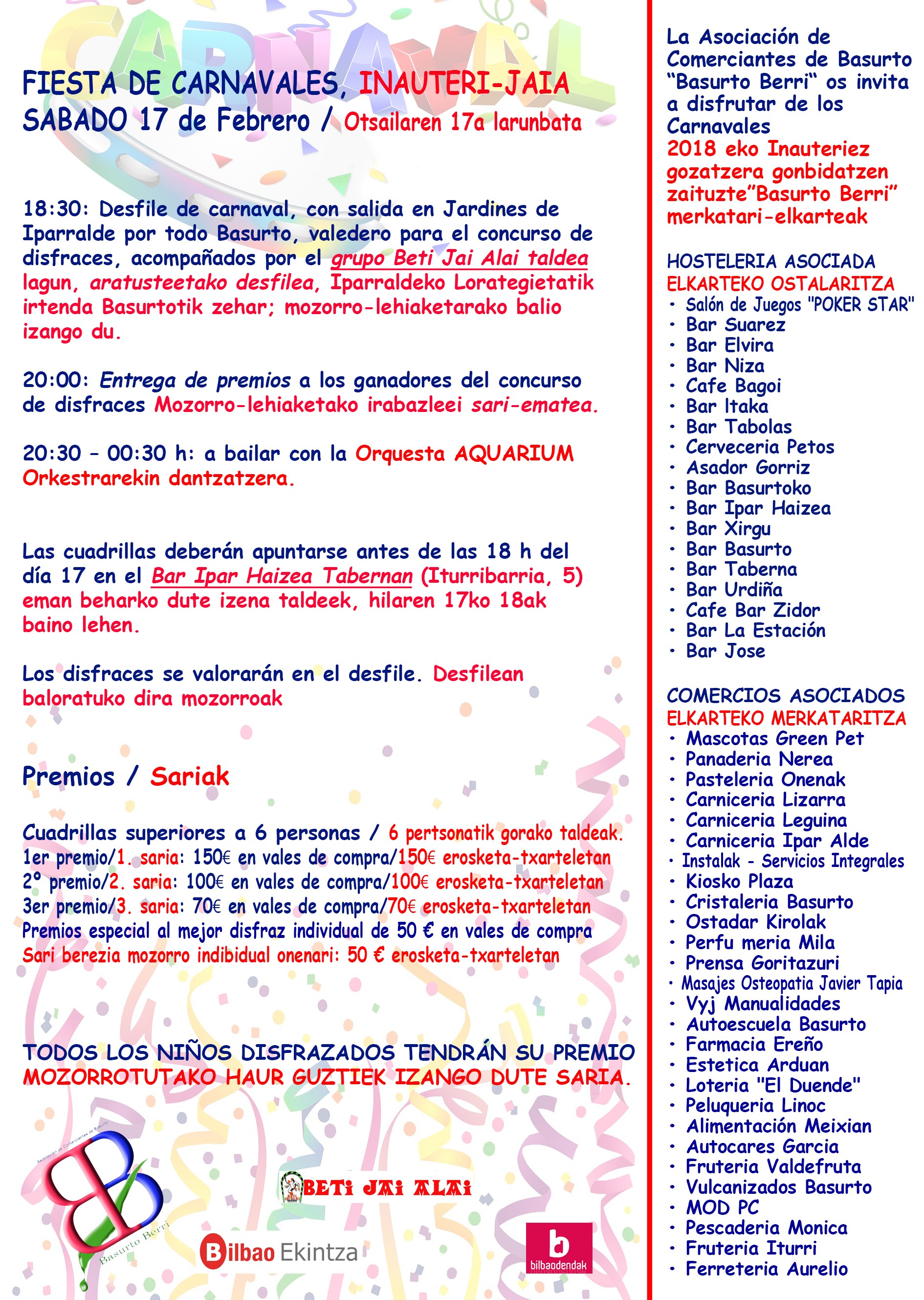 El sábado 17 de Febrero, tras los carnaveles de Bilbao, vienen los de Basurto. En la imagen puedes ver (pulsa en ella para ampliar) la actividades programadas por la Asociación de Comerciantes Basurto Berri.