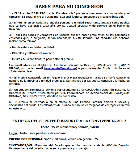 Como todos los años, se ha iniciado el proceso para elegir a la persona, grupo o entidad que sea depositario del Premio a la Convivencia de Basurto. Este premio se otorgará el 25 de Noviembre en una comida y el vecindario puede participar en la selección de candidatos o candidatas, como se explica en este enlace . Seguiremos informando