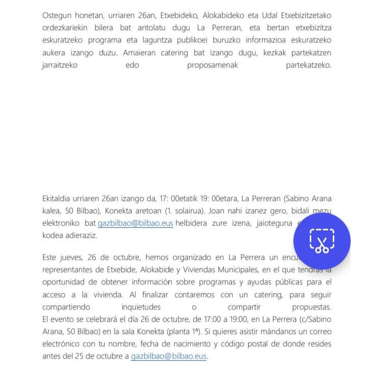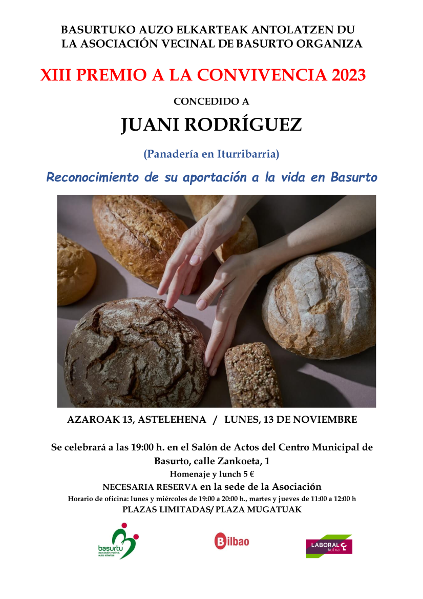 | Un año más hemos pensando en esa persona o colectivo que ha destacado por su relación con los vecinos y vecinas, por su amabilidad, por hacer barrio y estar siempre dispuesta con una sonrisa en su rostro. Por todo ello hemos creído que Juani Rodriguez, persona muy querida en Basurto y que regentó durante muchos años una panadería en la calle Iturribarría es la persona que bien merece este reconocimiento. Este pequeño y emotivo homenaje tendrá lugar el día 13 de noviembre a las 19:00h en el Salón de Actos del Centro Municipal de Basurto. Es necesario inscribirse en la oficina de la Asociación Vecinal. Plazas limitadas. Mas datos, en el cartel. |